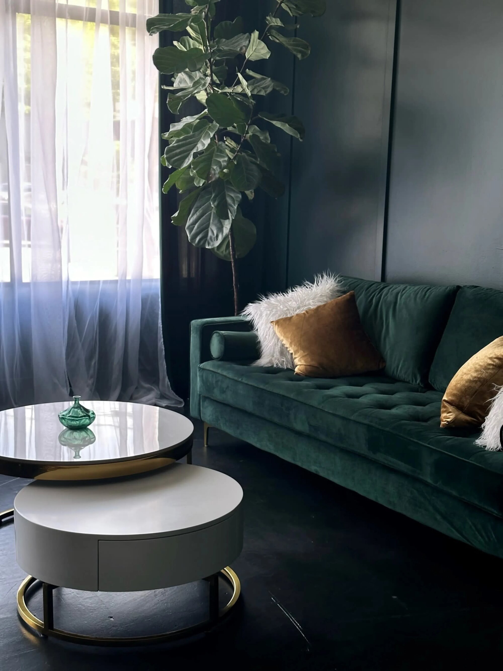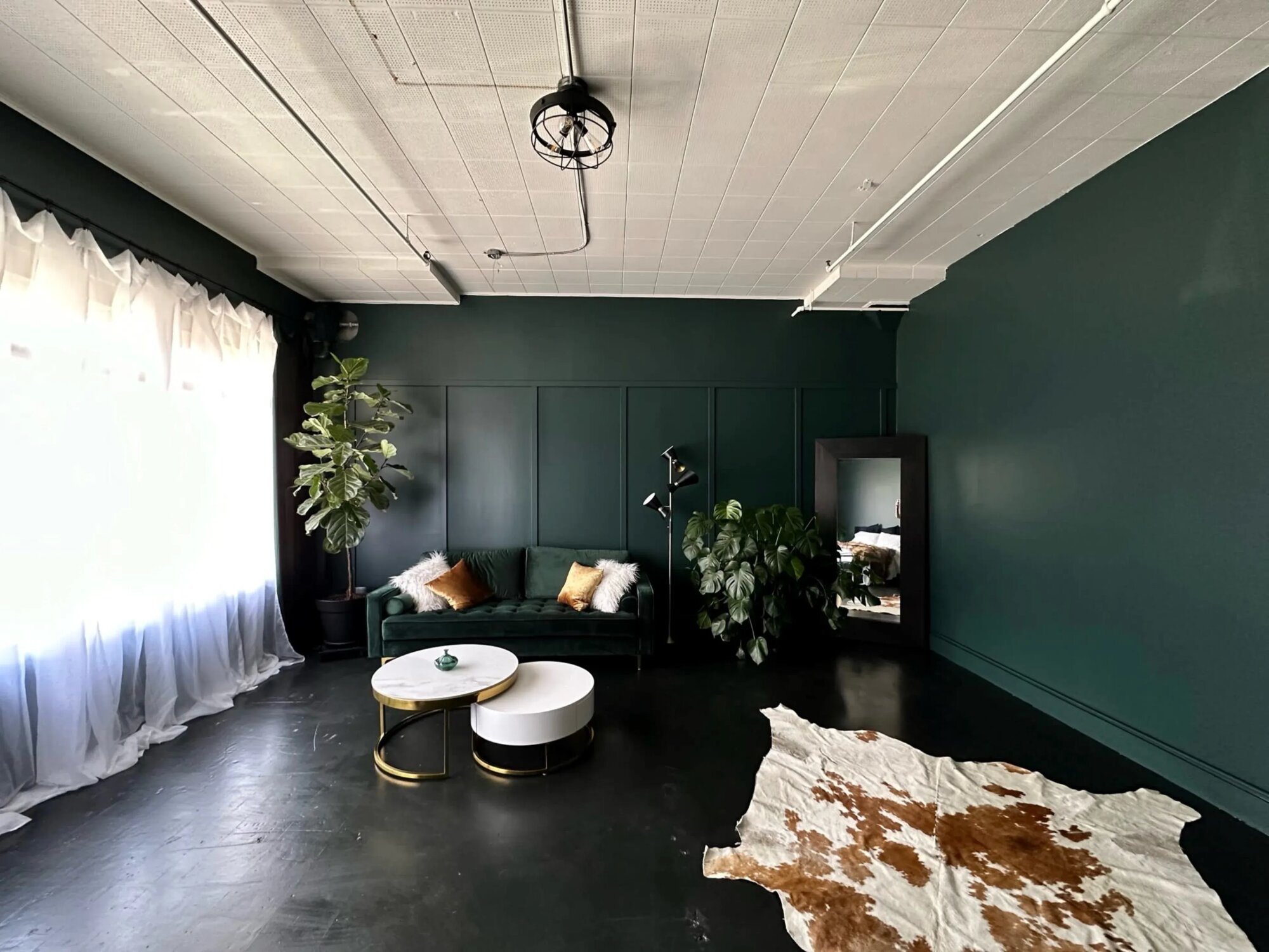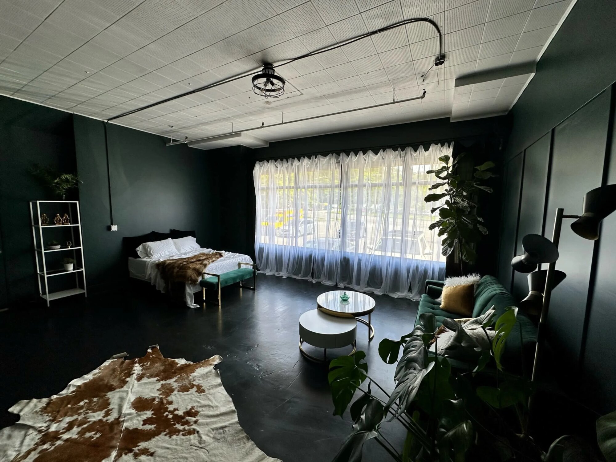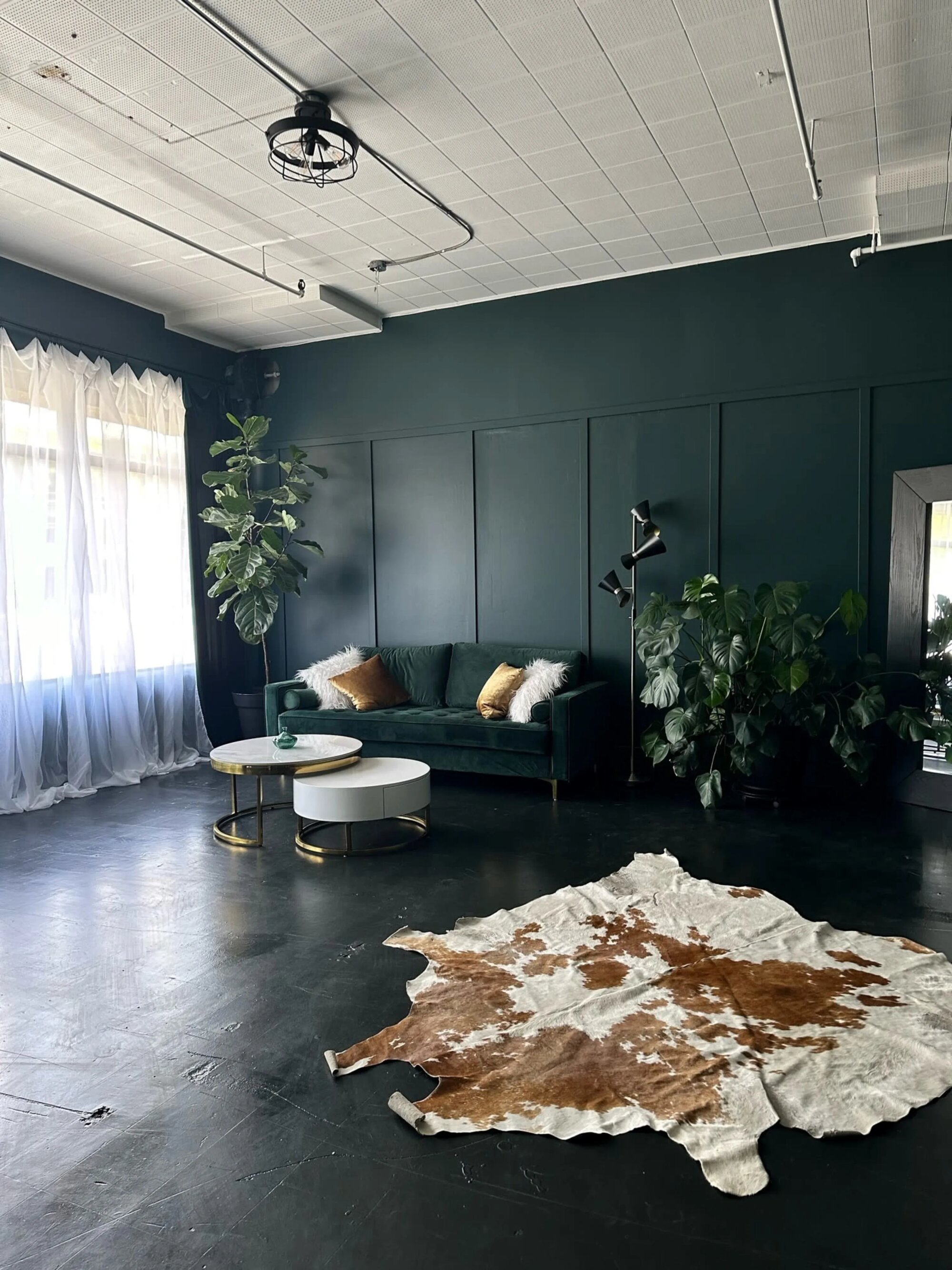 Interiér s tmavozelenými stenami, vysokým stropom a výrazným, ale čistým dizajnom. Priestor má veľké okná s jemnými závesmi, ktoré dávajú mäkké prirodzené svetlo počas dňa. Set kombinuje zelený zamatový gauč, neutrálne stolíky, rastliny a mobilné prvky vrátane postele na kolieskach. Dispozícia je otvorená a umožňuje rýchlu zmenu kompozície. Nábytok a rekvizity sú presúvateľné, priestor funguje ako hotový set aj ako prázdne plátno. Hodí sa na foto a video produkciu, rozhovory, portréty, boudoir, branding aj menšie filmové scény. Podlahy sú hladké, steny jednotné a svetlo konzistentné, čo uľahčuje kontrolu obrazu. Priestor je tichý, kontrolovateľný a vhodný pre malé až stredné štáby.