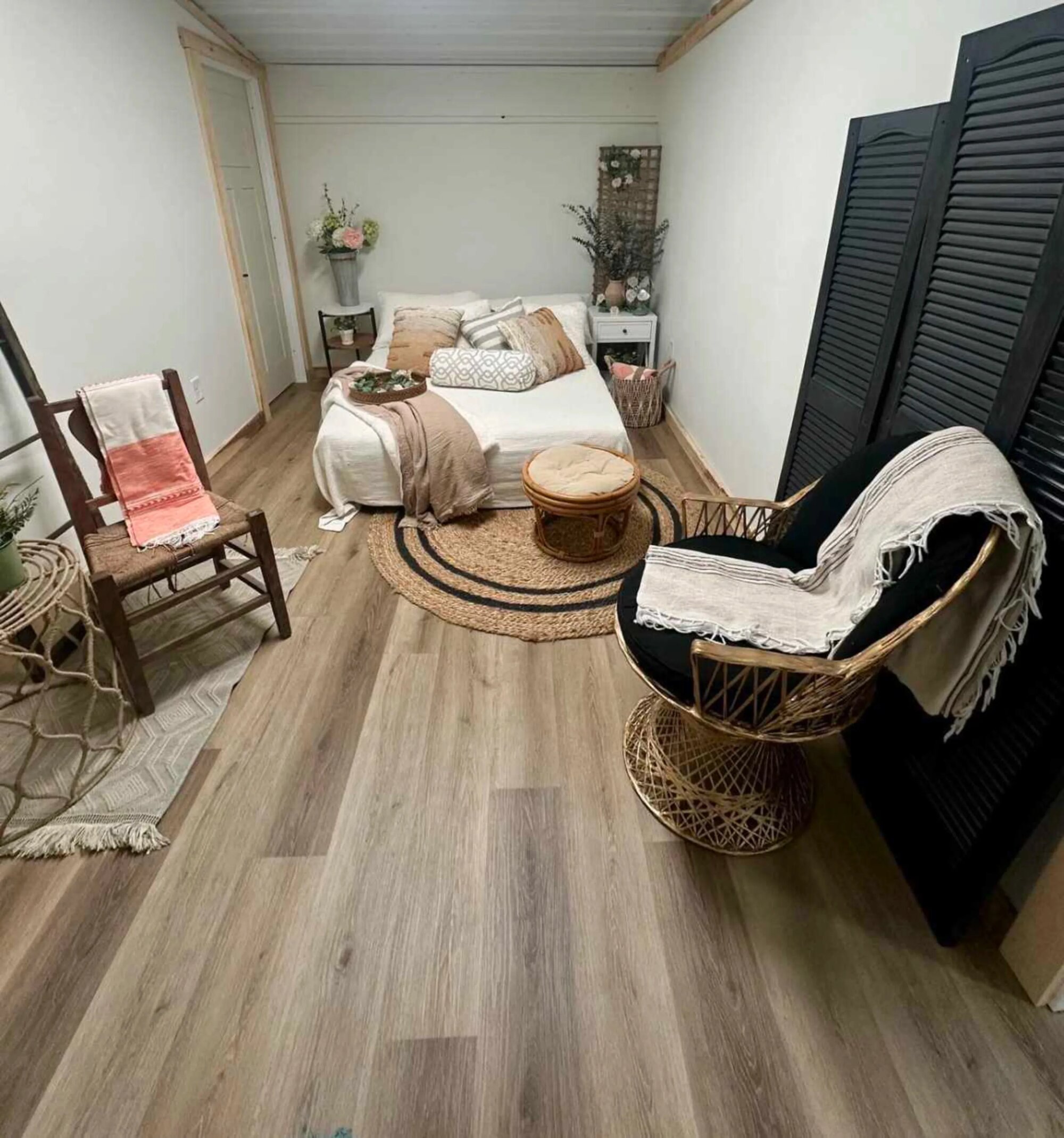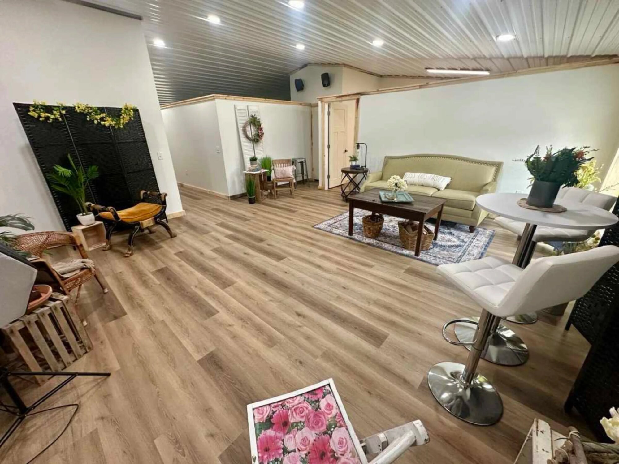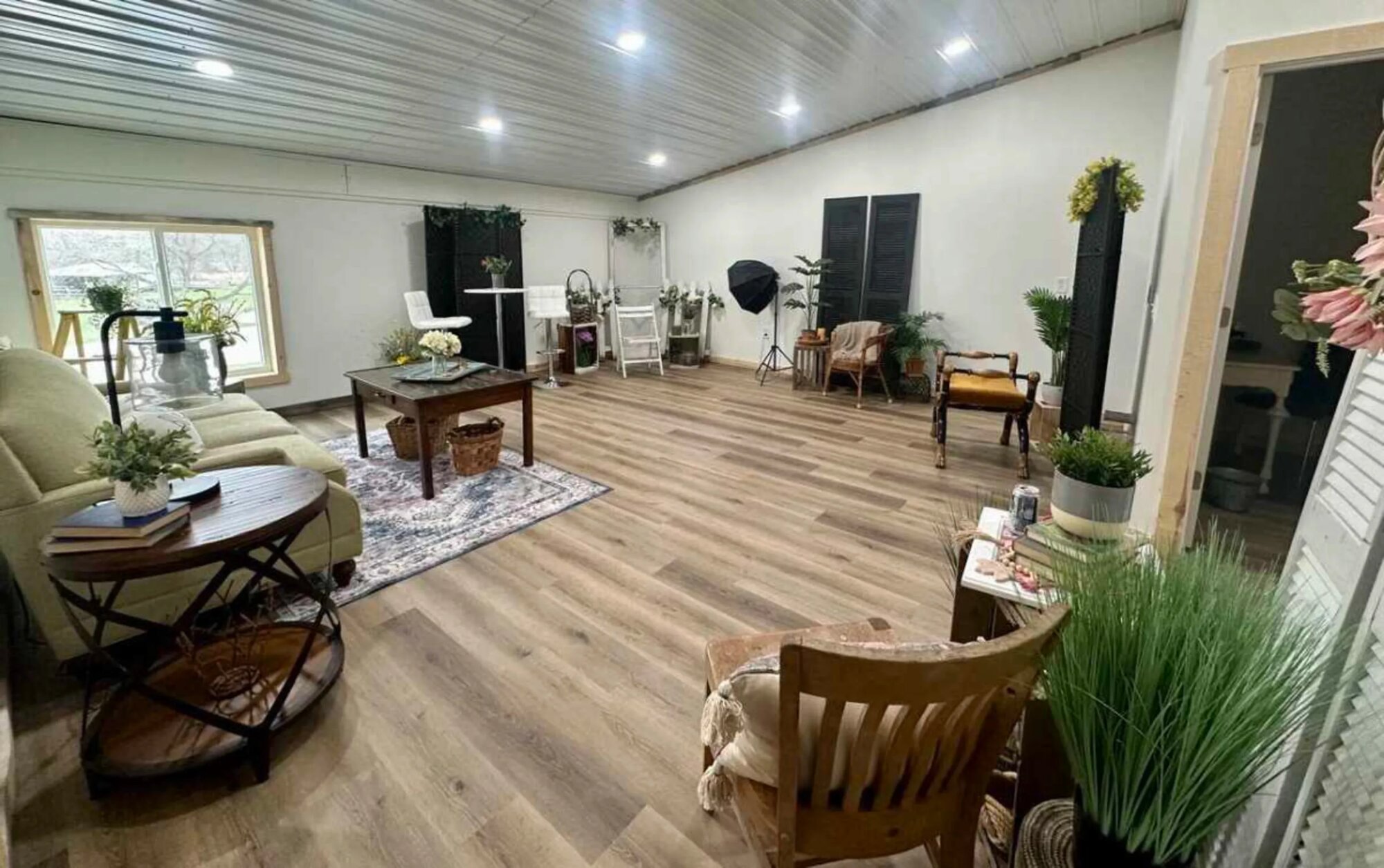 Prenajímam štúdio kde už máme postavených viac ako pätnásť pripravených setov - spálňa, obývačka, foto kútiky... Nemusíte nič stavať ani zariaďovať, príďete a vyberáte si čo vám padne k projektu. Čierne okenice a panely sa dajú presúvať medzi setmi, takže keď potrebujete izolovať nejakú scénu alebo zablokovať svetlo, viete to rýchlo vyriešiť. Okno pustí cez deň slušné množstvo prirodzeného svetla do celého priestoru. Máme tu aj pár stojanov so svetlami ktoré môžete použiť, alebo prineste vlastné a pripevníte ich na lišty v strope. Nábytok ide posúvať medzi setmi podľa toho čo práve robíte, nič nie je fixné. Steny sú biele takže keď chcete čistý backdrop alebo len neutrálne pozadie.