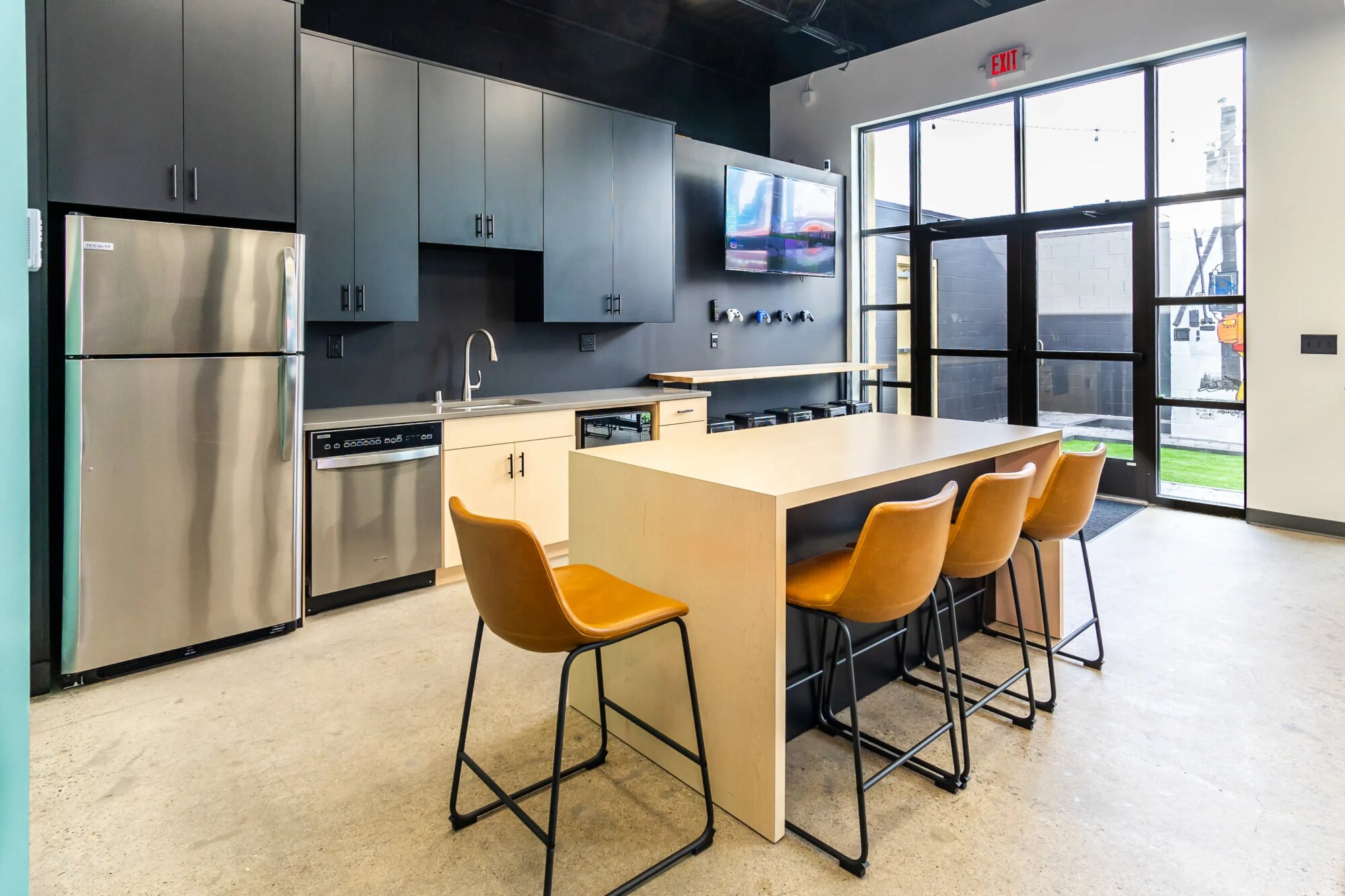 Veľký otvorený priestor s hernou zónou a oddychovými časťami. Čierne stropy s viditeľnými rúrkami a osvetlením, betónová podlaha. Tmavé steny s farebnými akcentmi – tyrkysová, zelená. Basketbalový kôš, arkádové hry, TV obrazovky. Kuchyňa má šedé skrinky, svetlé ostrovčeky s barovými stoličkami, umývadlo, chladnička. Pracovné stoly s drevenými doskami, posedenie v rôznych častiach priestoru. Herné ovládače pripevnené pri obrazovke. Vysoké stropy, veľké okná, industriálny vzhľad. Stoly a stoličky sa dajú presúvať.
