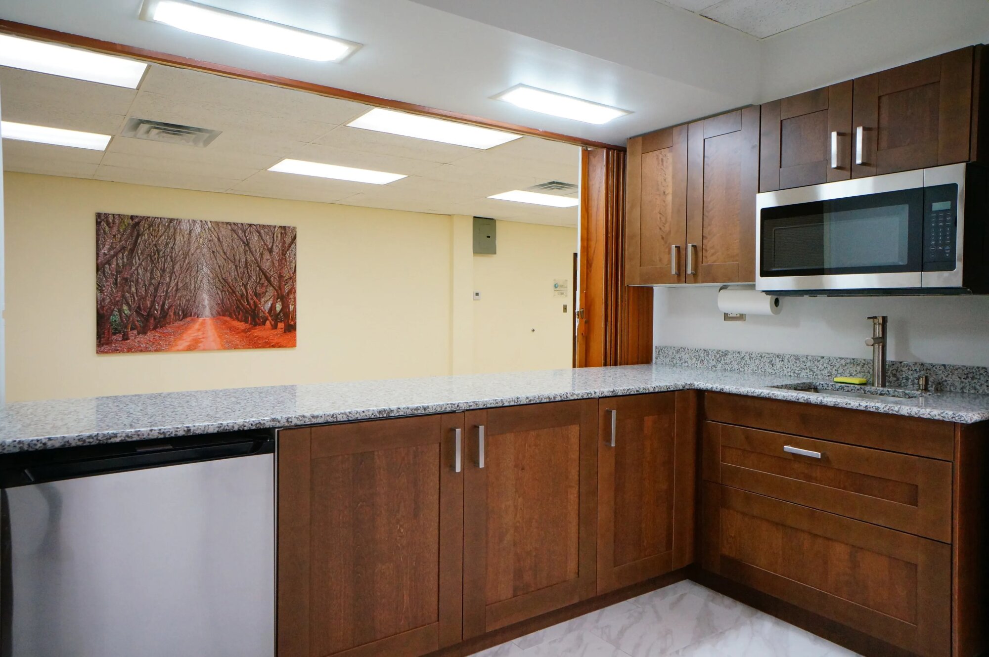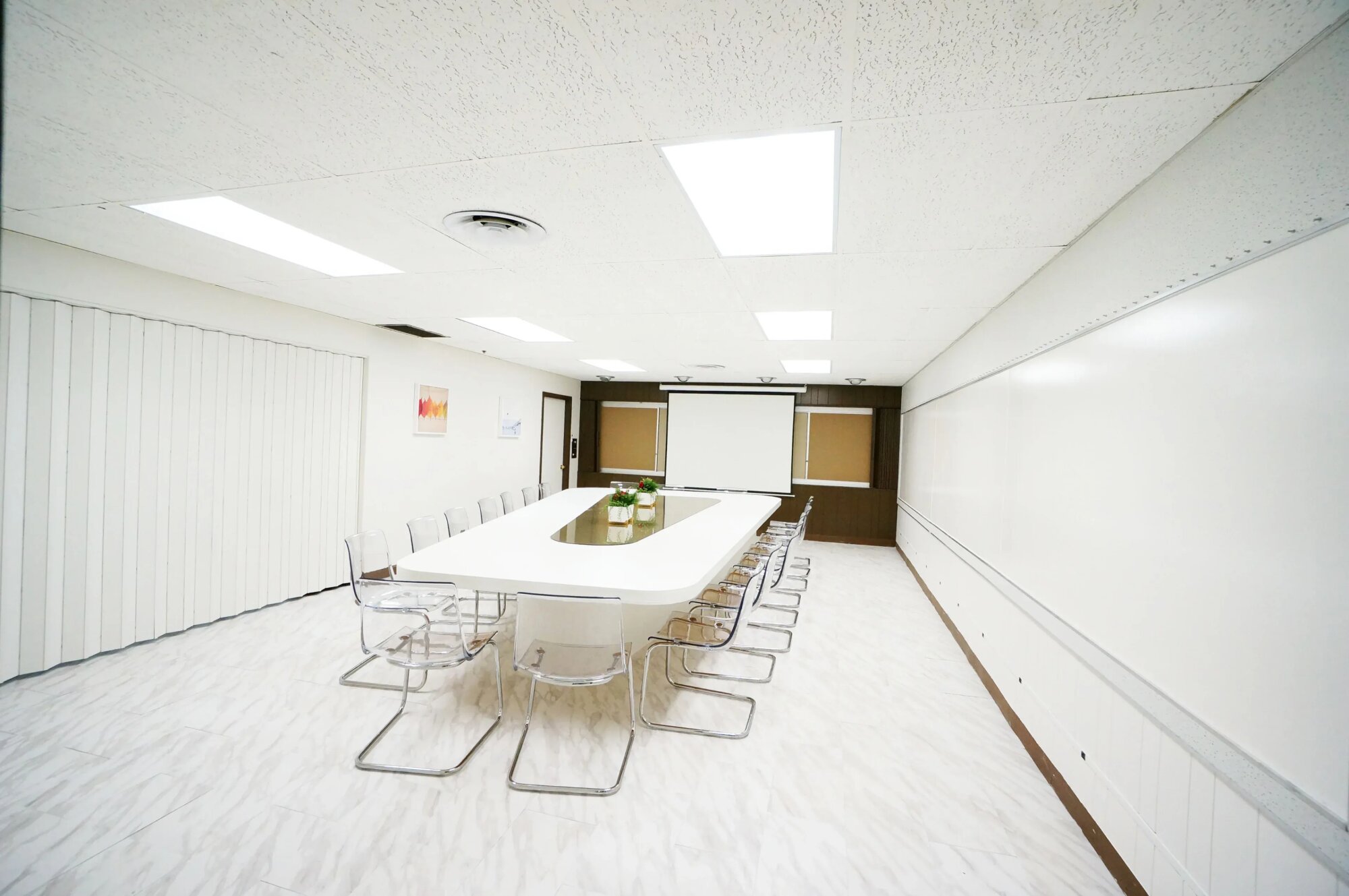 Konferenčná miestnosť pre cca 20 ľudí. Svetlá v strope poskytujú dostatočné svetlo, čisté biele steny, nízky podhľad. Stoly a stoličky sa dajú odstrániť. Kuchynka s tmavým drevom v rohu. Projekčná plocha, nástenky, vertikálne žalúzie. Jeden veľký priestor, dá sa preusporiadať. Štandardný korporátny dizajn – vhodné na biznis scény, rozhovory, firemné prostredie.