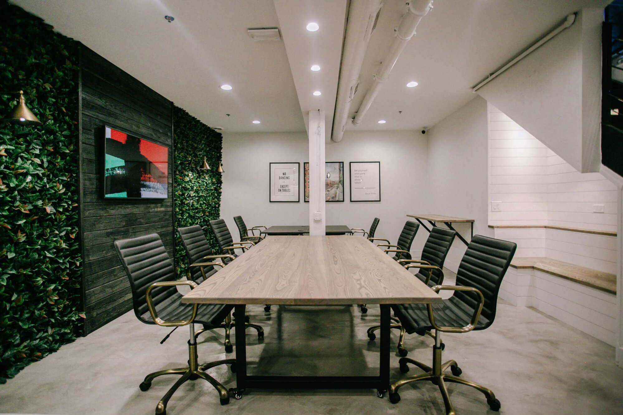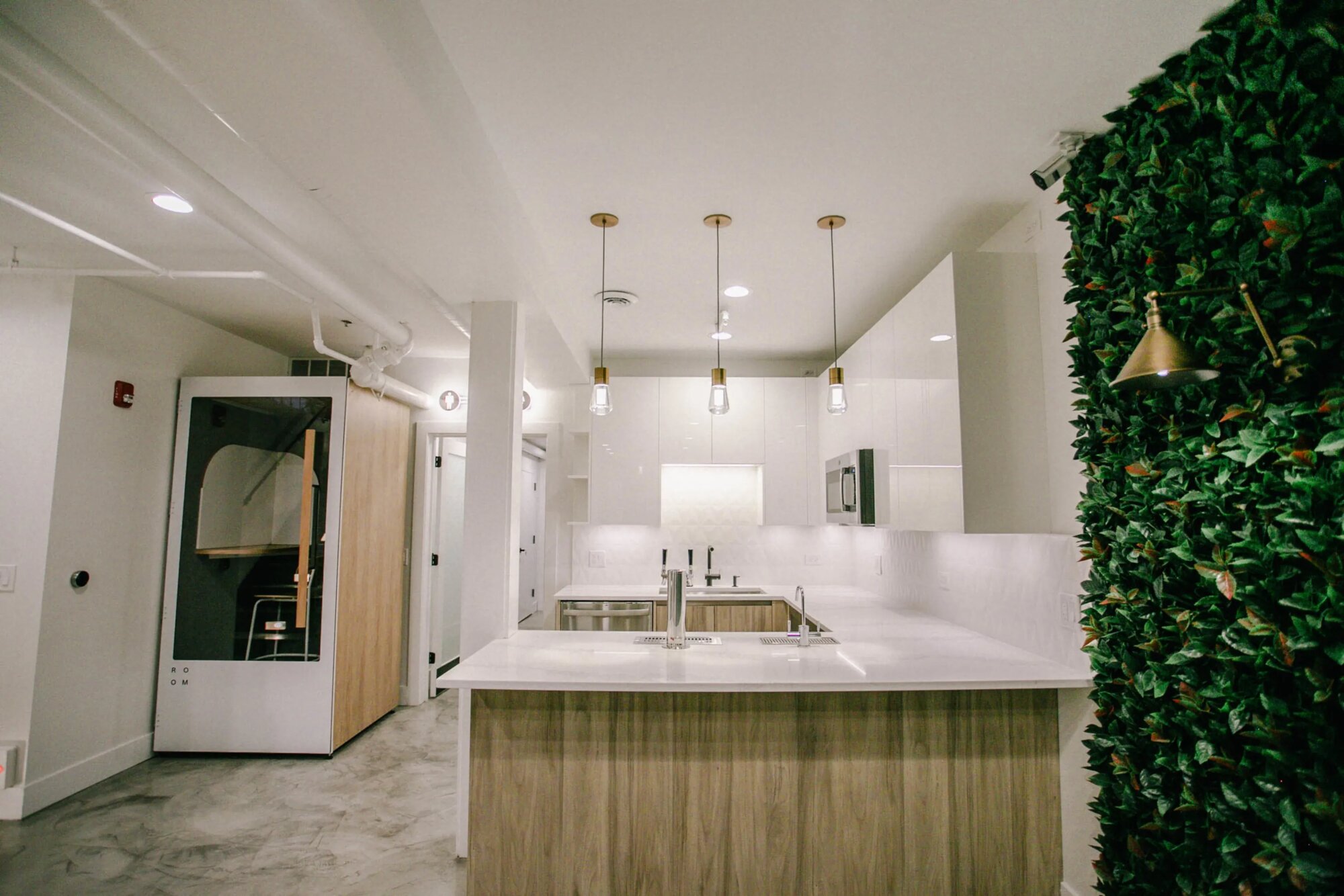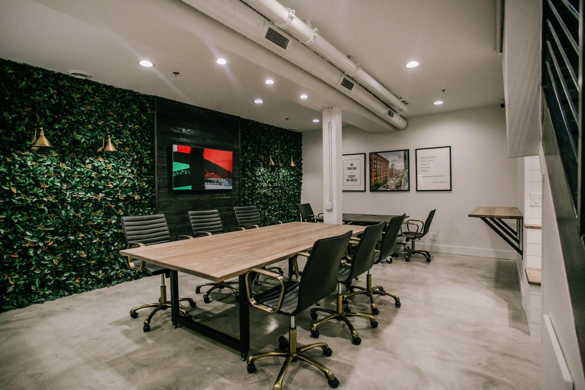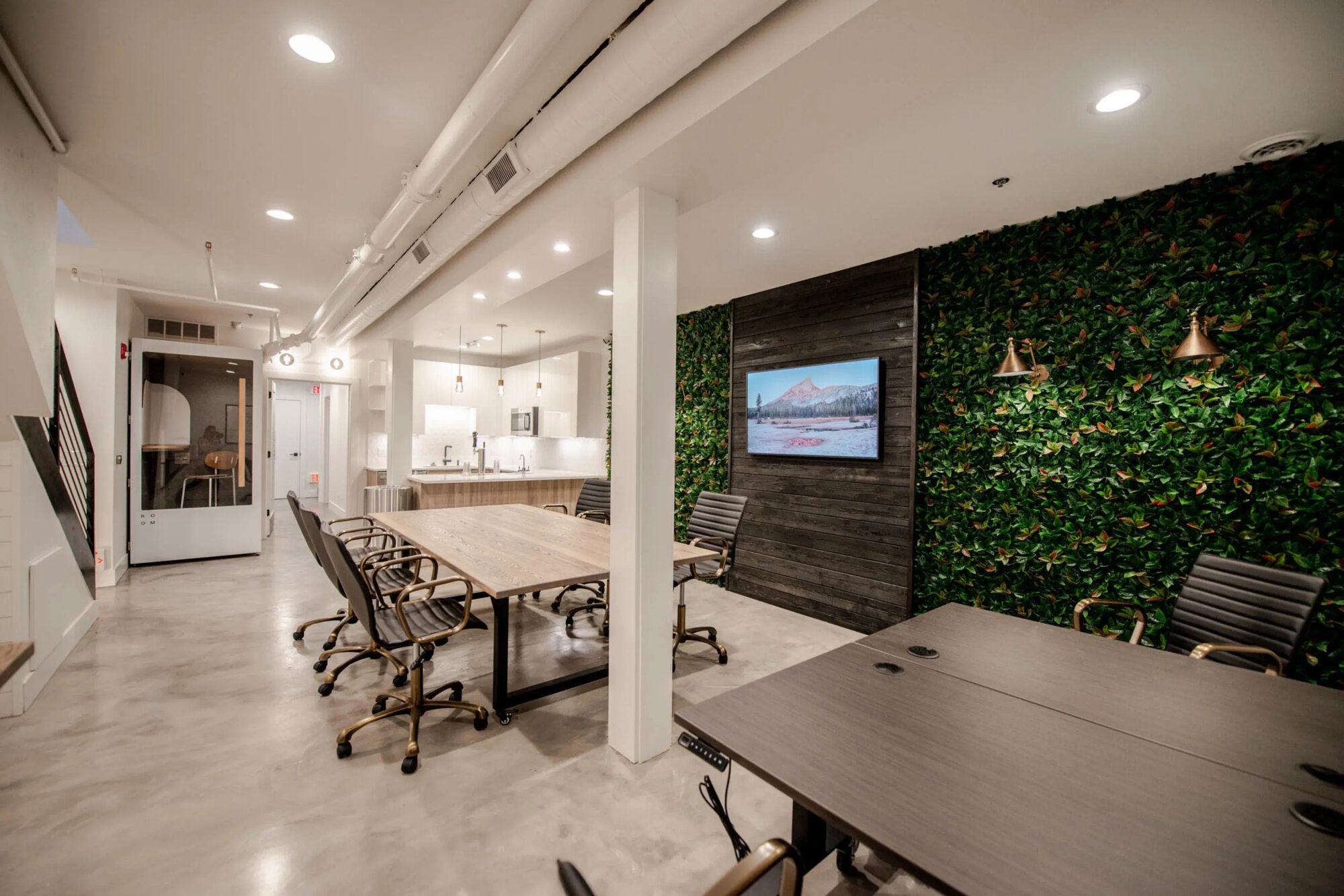 Otvorený kancelársky priestor s betónovými podlahami a vysokými stropmi. Hlavná miestnosť má konferenčný stôl a kancelárske stoličky, steny pokryté umelou zeleňou. TV namontovaná na tmavom drevenom paneli, biele steny, industriálny strop s viditeľnými rúrkami. Kuchyňa má biely ostrovček s dreveným obkladom, biele skrinky. Všetko je moderné a čisté. Priestor je rozdelený na viacero častí – konferenčná miestnosť, kuchyňa, pracovné stoly. Betónová podlaha všade, rastlinné steny dodávajú farbu. Priestor pôsobí ako startup alebo moderná kancelária. Stoly sa dajú presunúť, dá sa s tým pracovať.