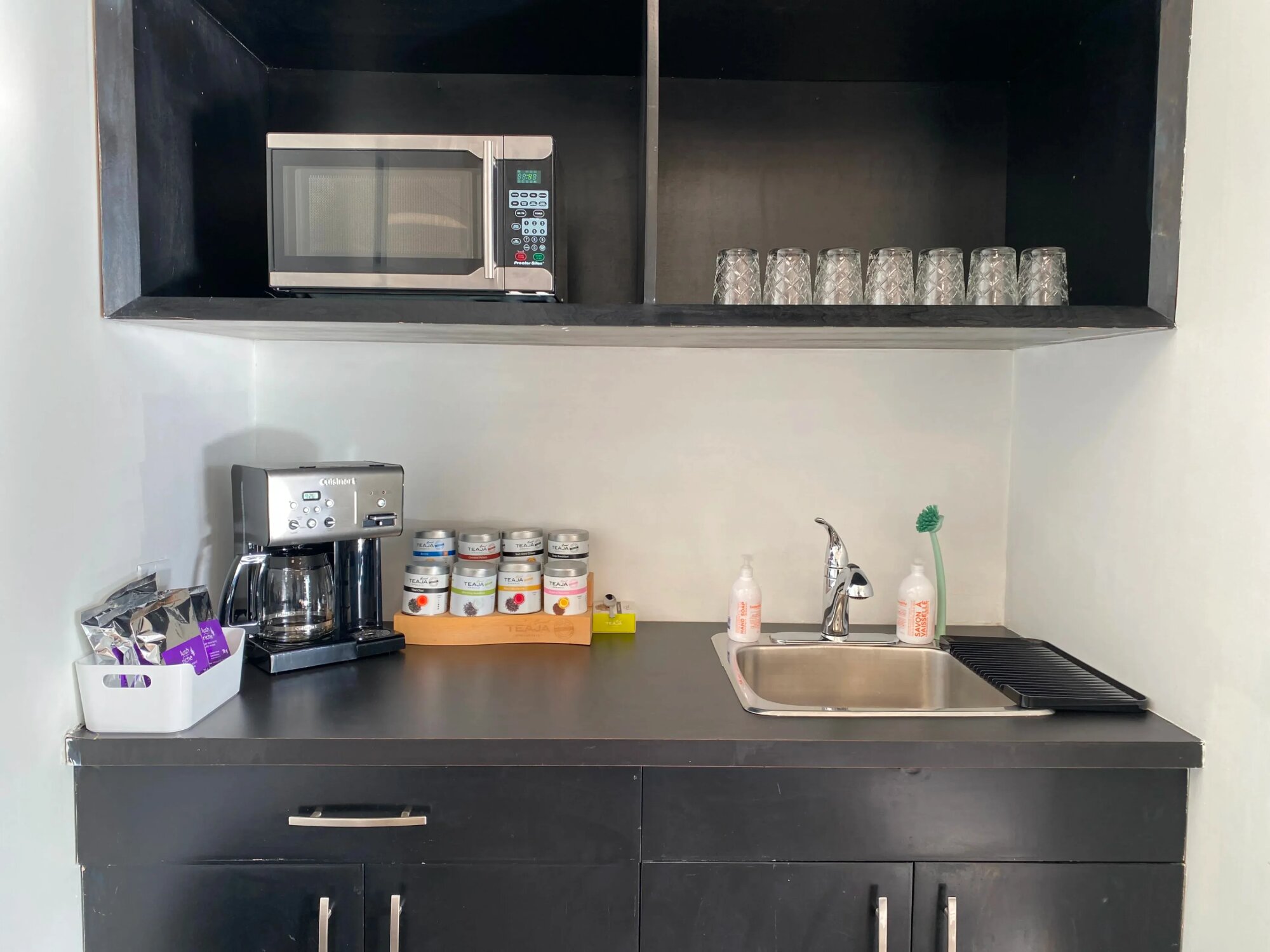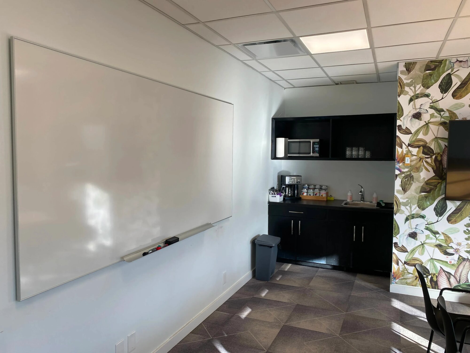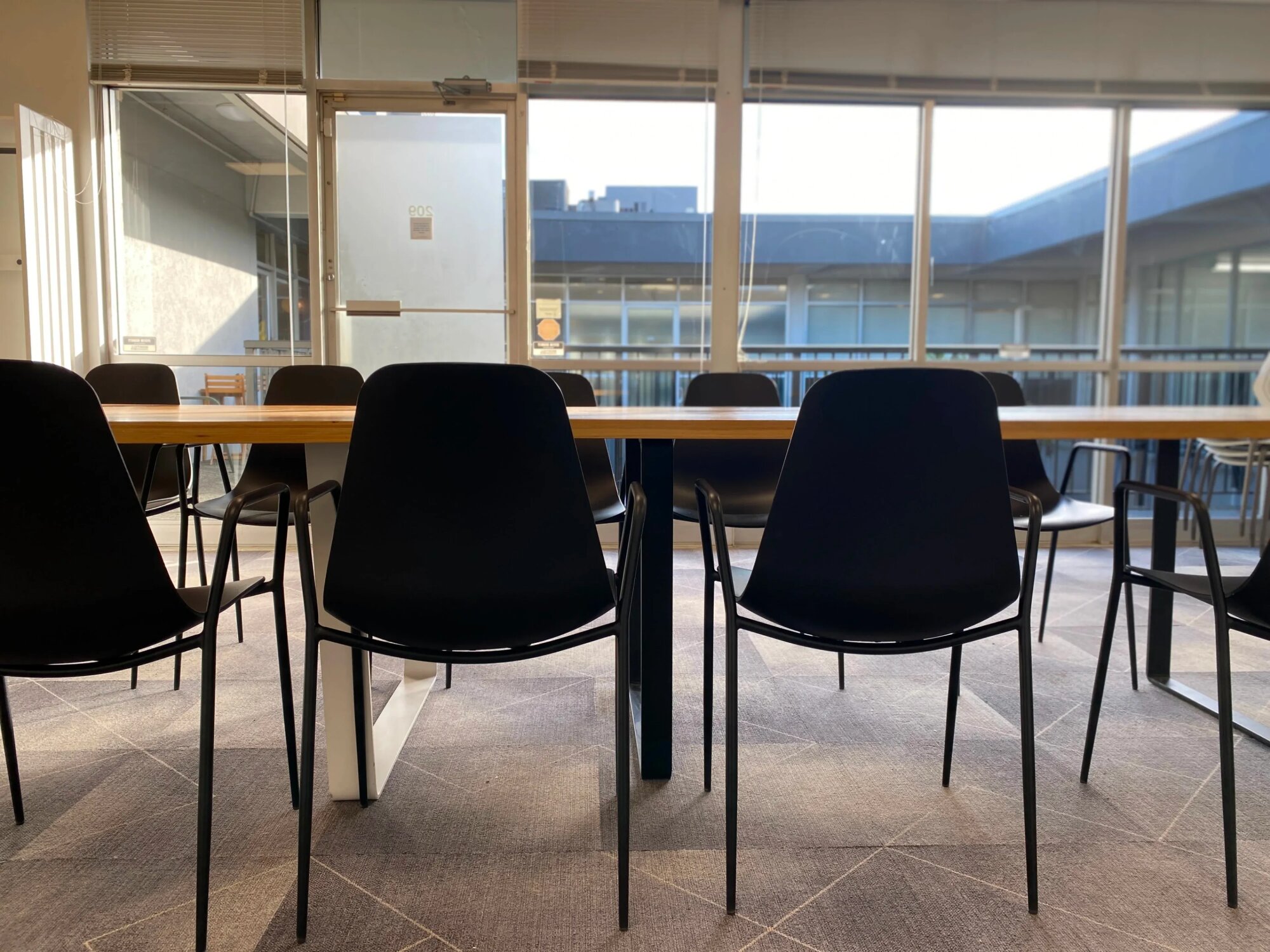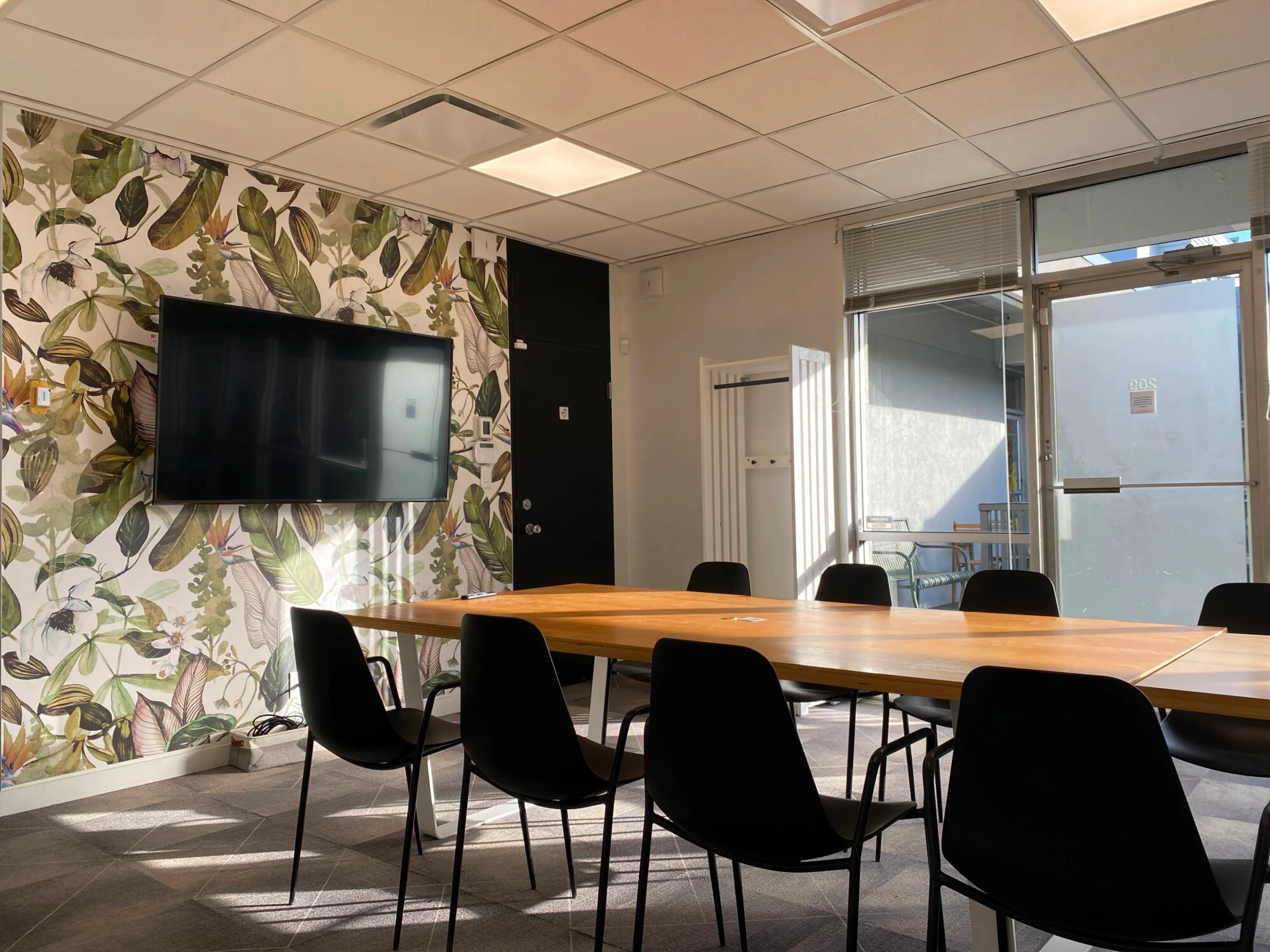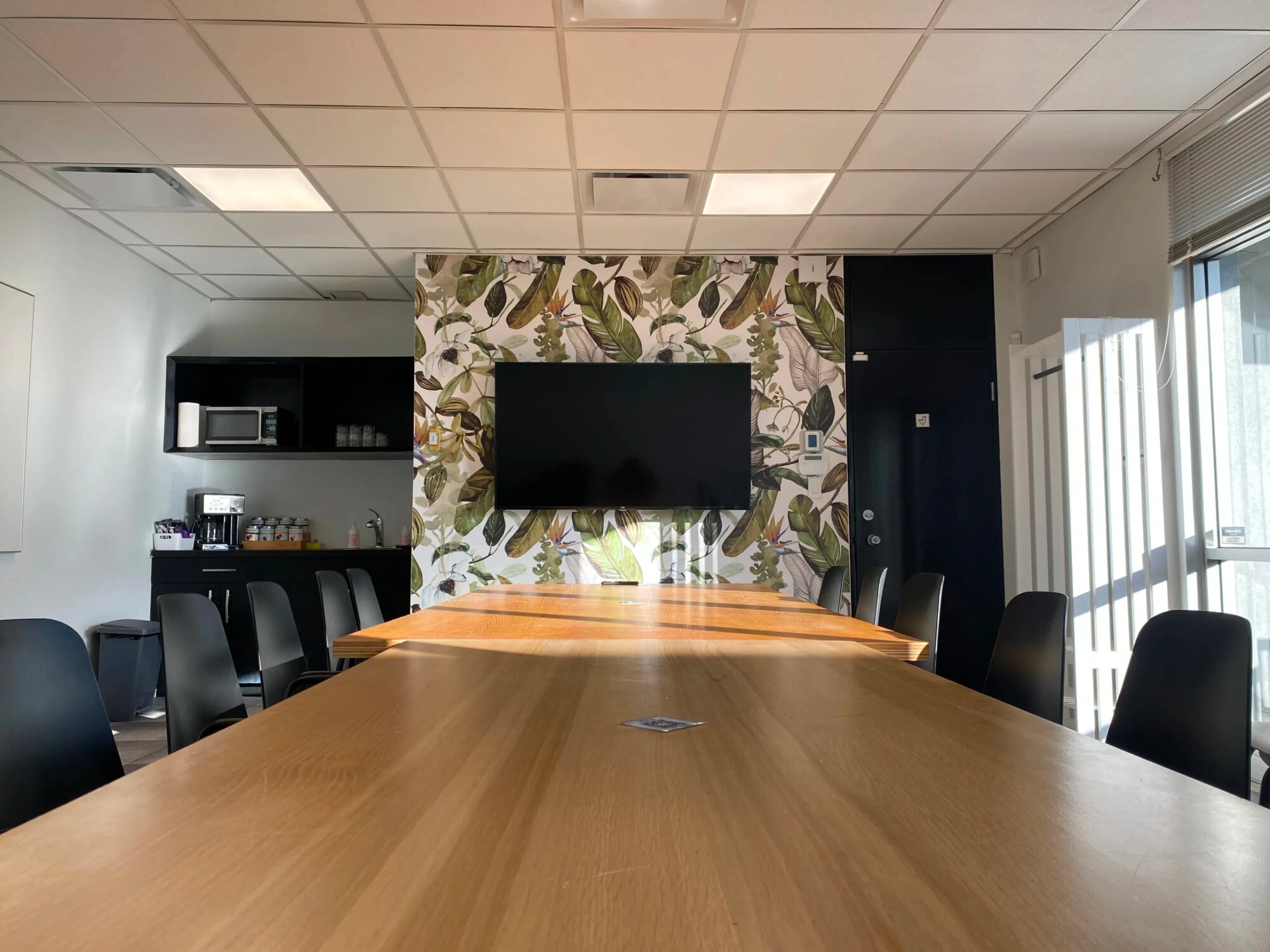 Kancelárska miestnosť s veľkým dreveným konferenčným stolom pre cca 12 ľudí. Čierne stoličky, tapeta s tropickými listami za TV. Podlahové okná po celej dĺžke miestnosti s výhľadom na terasu. Terasa prístupná cez posuvné dvere – vonku je tam posedenie, dá sa využiť ak je pekne. Vnútri je šedá dlažba, stropy s osvetlením, priestor pôsobí svetlo. Kuchynka v rohu s čiernymi skrinkami, kávovar, mikrovlnka, umývadlo. Biela nástenka. Stôl a stoličky sa dajú presunúť alebo odstrániť, priestor je flexibilný. Veľa denného svetla cez okná, žalúzie sa dajú stiahnuť. Nachádza sa v kancelárskej budove, typické firemné prostredie.