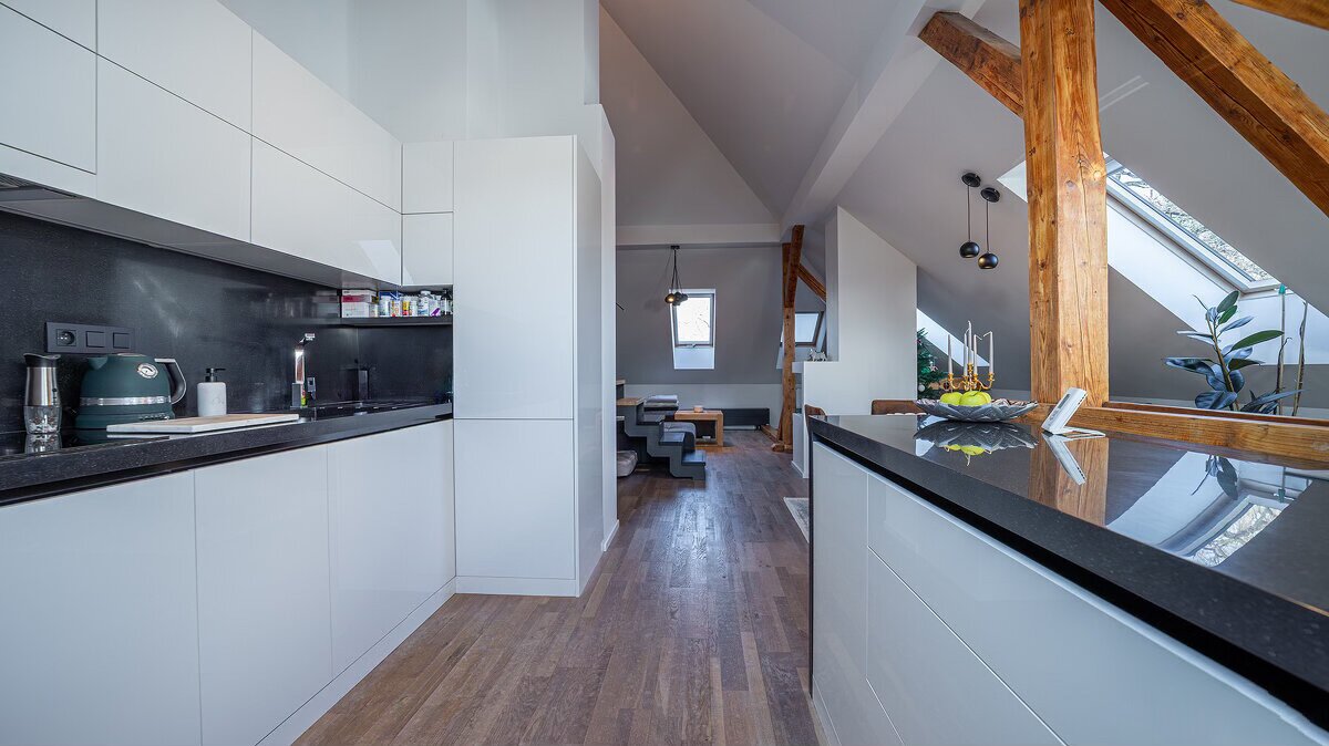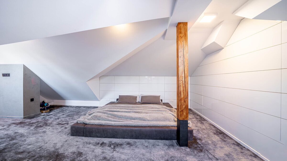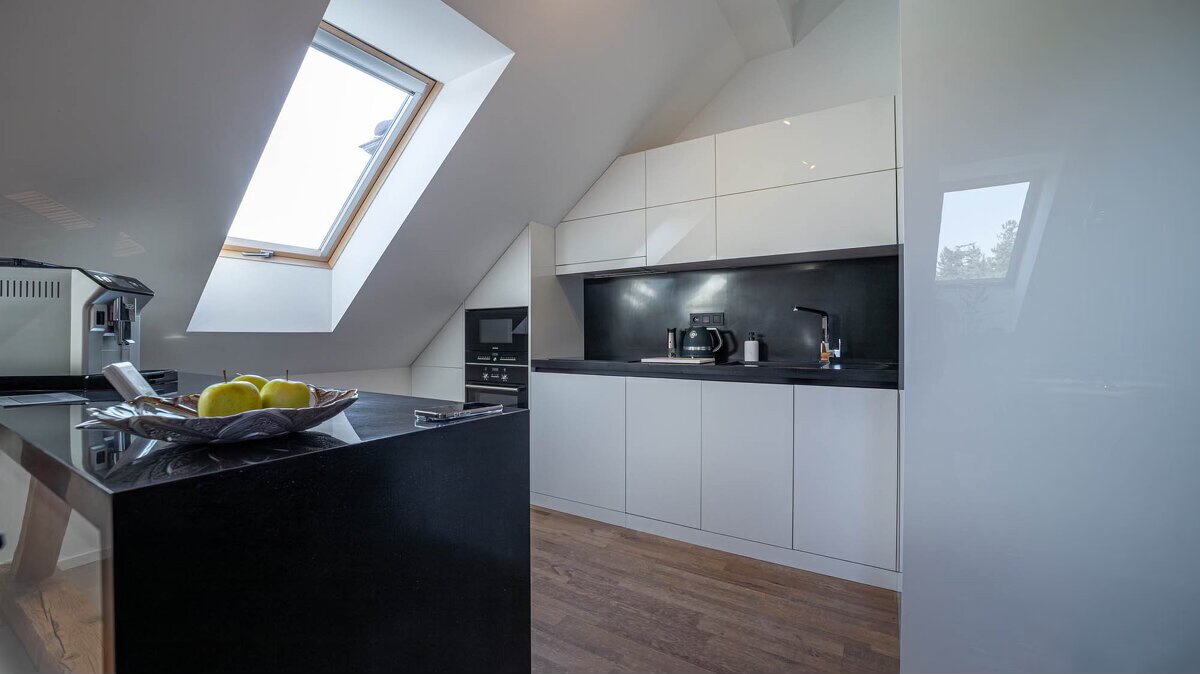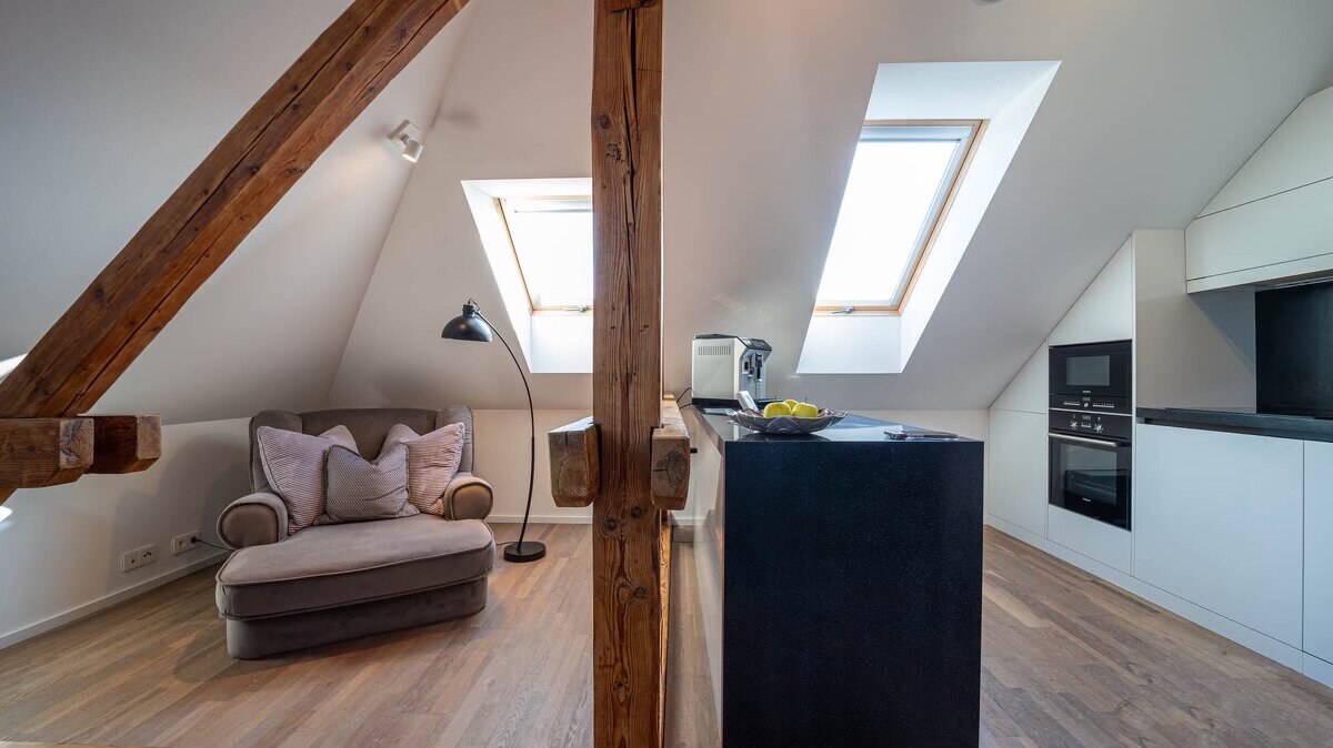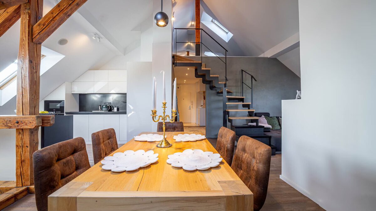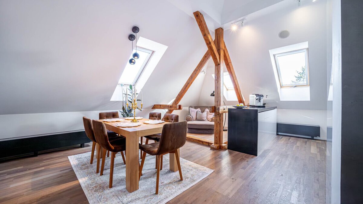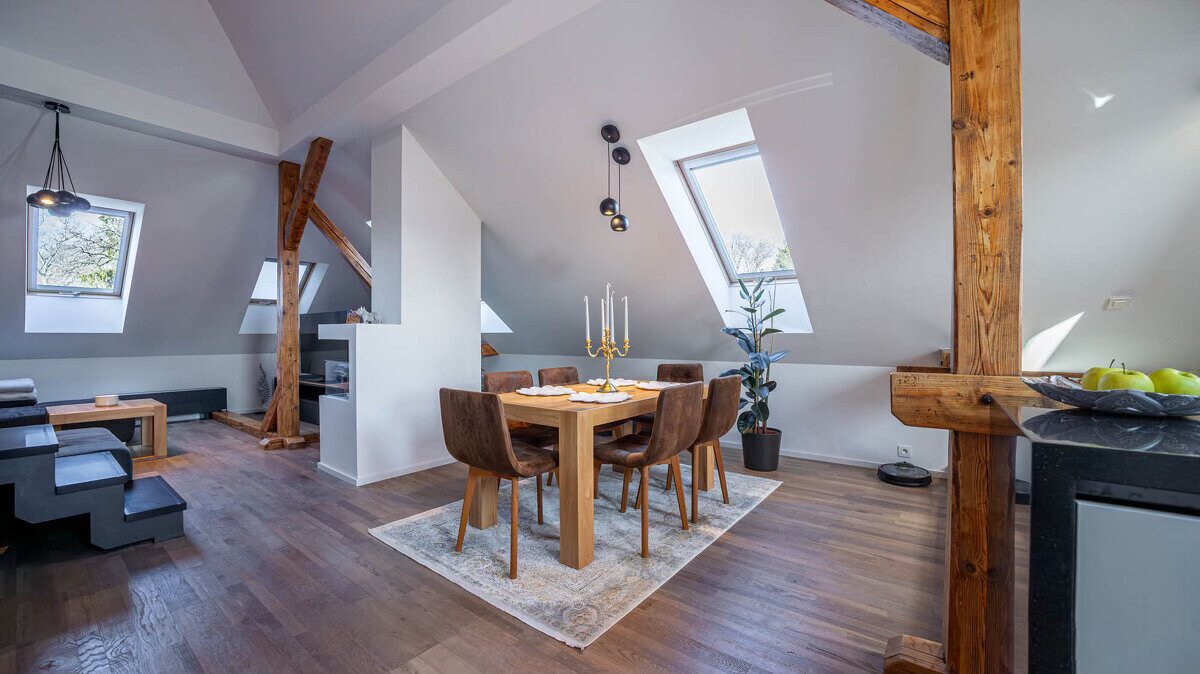 Otvorený priestor so skosenými stropmi a kombináciou trámov – mramor, drevo, kameň. Priestor je zariadený v prírodných tónoch, minimalisticky. Vhodný na rôzne propagačné videá.