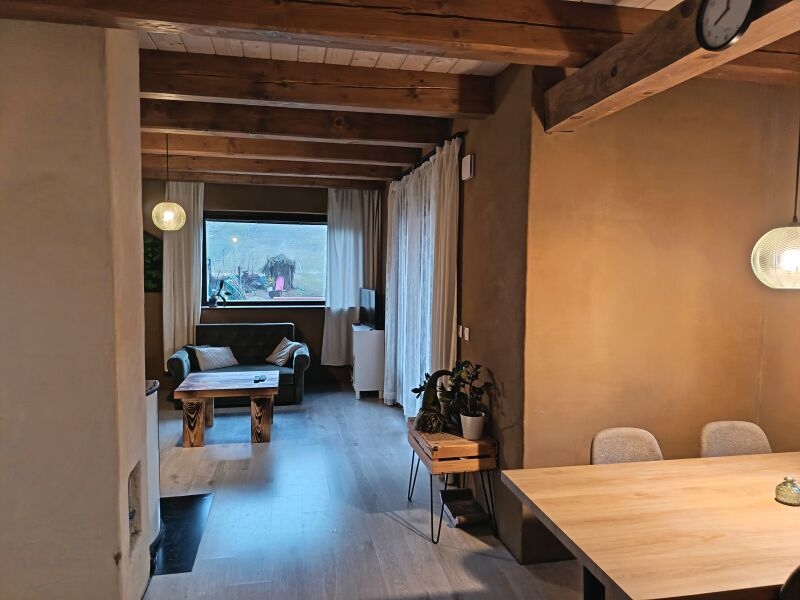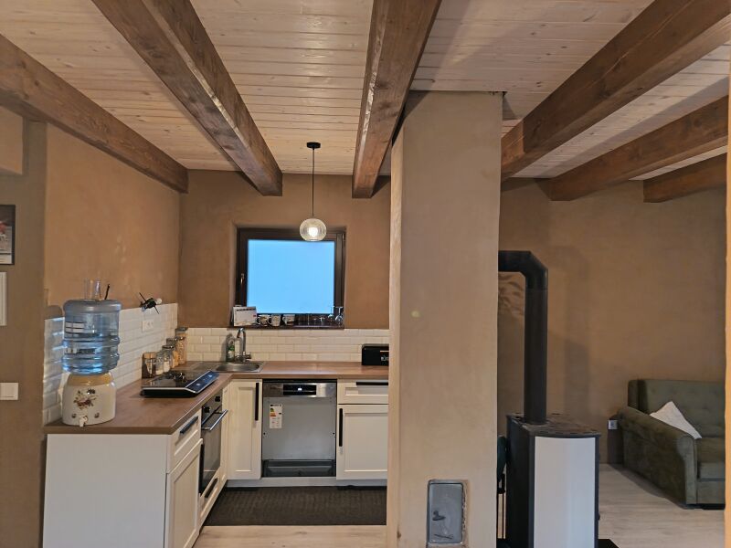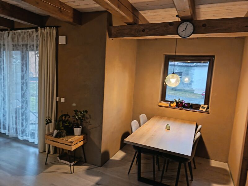 Dom s hlinenymi a dekoračnými omietkami Fasada nedokončená Drevené stropy, piecka Podkrovie Veľká záhrada, rovina aj kopec, z kopca krásna panoráma.
