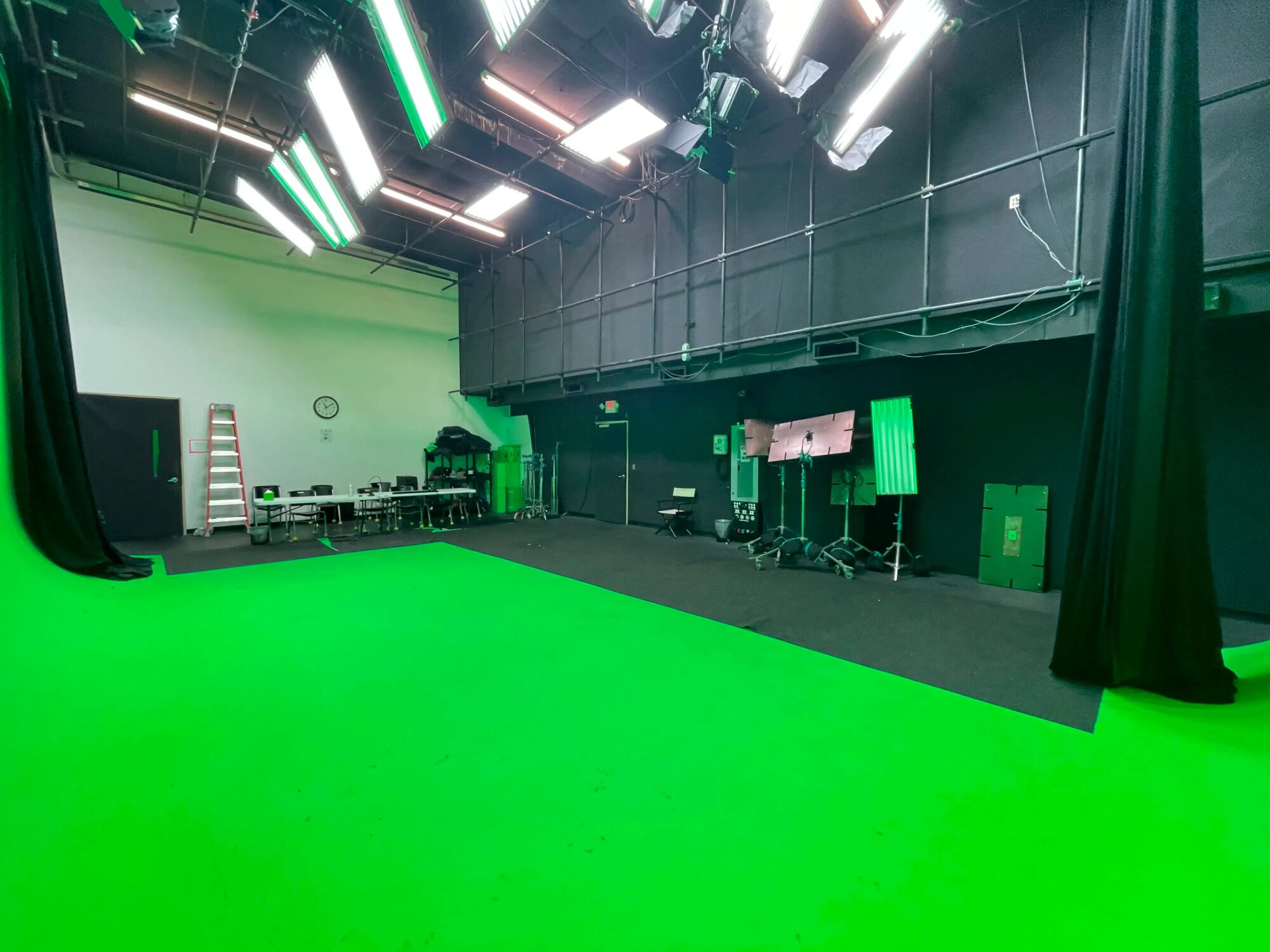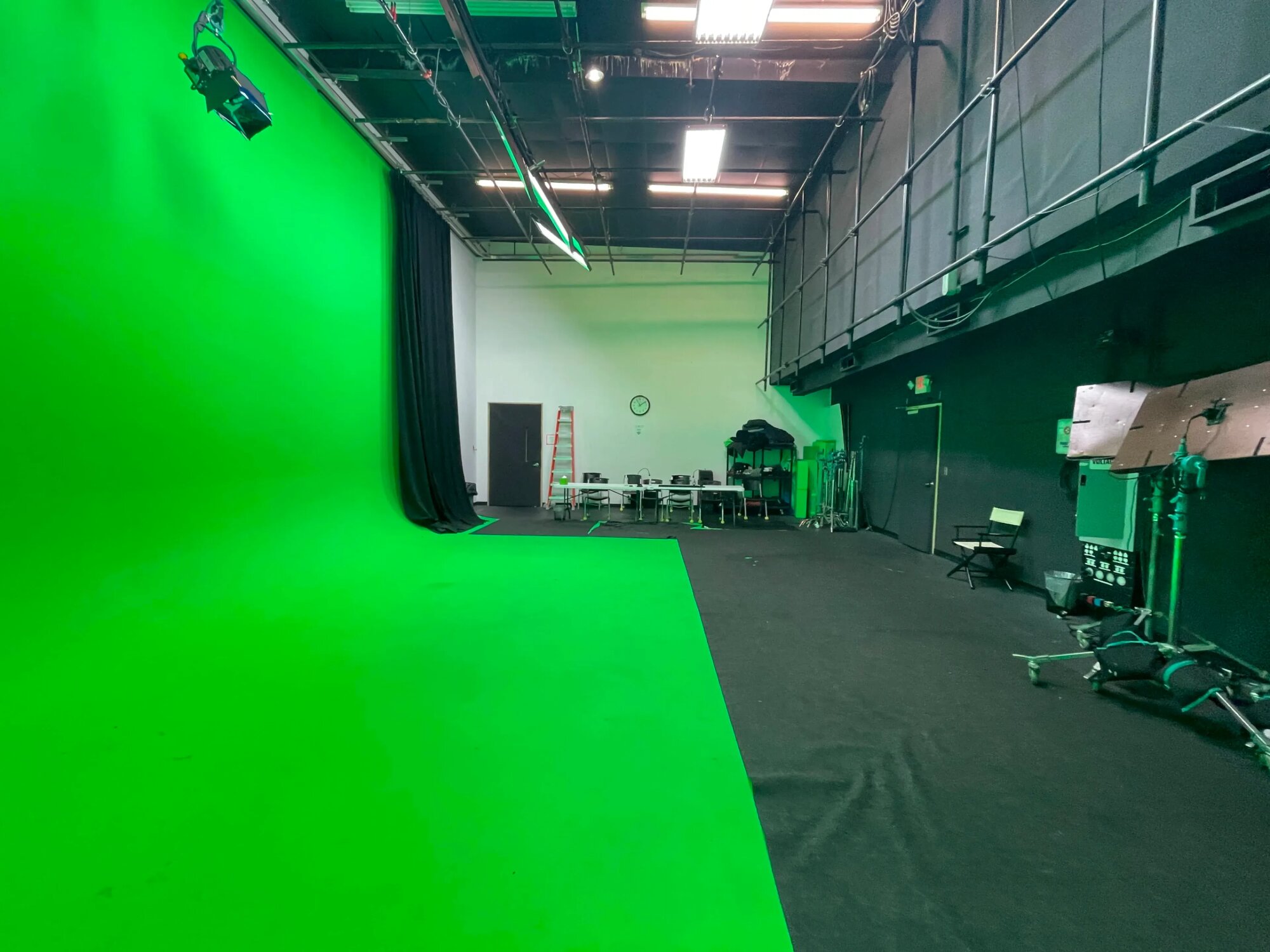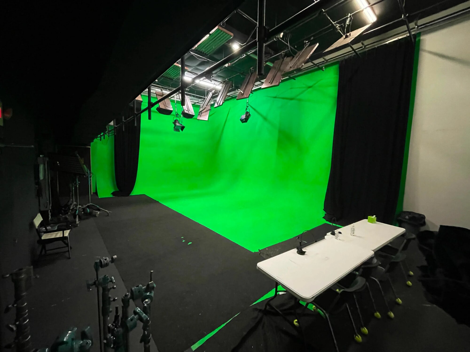 Plne funkčné green screen štúdio určené najmä na video natáčanie. Priestor má veľkú zelenú plochu s plynulým prechodom podlahy do steny, vhodnú na keying, virtuálne pozadia a postprodukciu. Aj pre väčšie scény, viac kamier a techniku. Svetlá sú zavesené, dajú sa rozumne nastaviť a priestor je tichý. Je tu dosť miesta pre štáb, technické zázemie aj prípravu scény. Všetko je riešené prakticky a produkčne. Vhodné pre reklamy, rozhovory, virtuálne scény a projekty, kde je dôležitá konzistentná zelená plocha a kontrola nad svetlom.