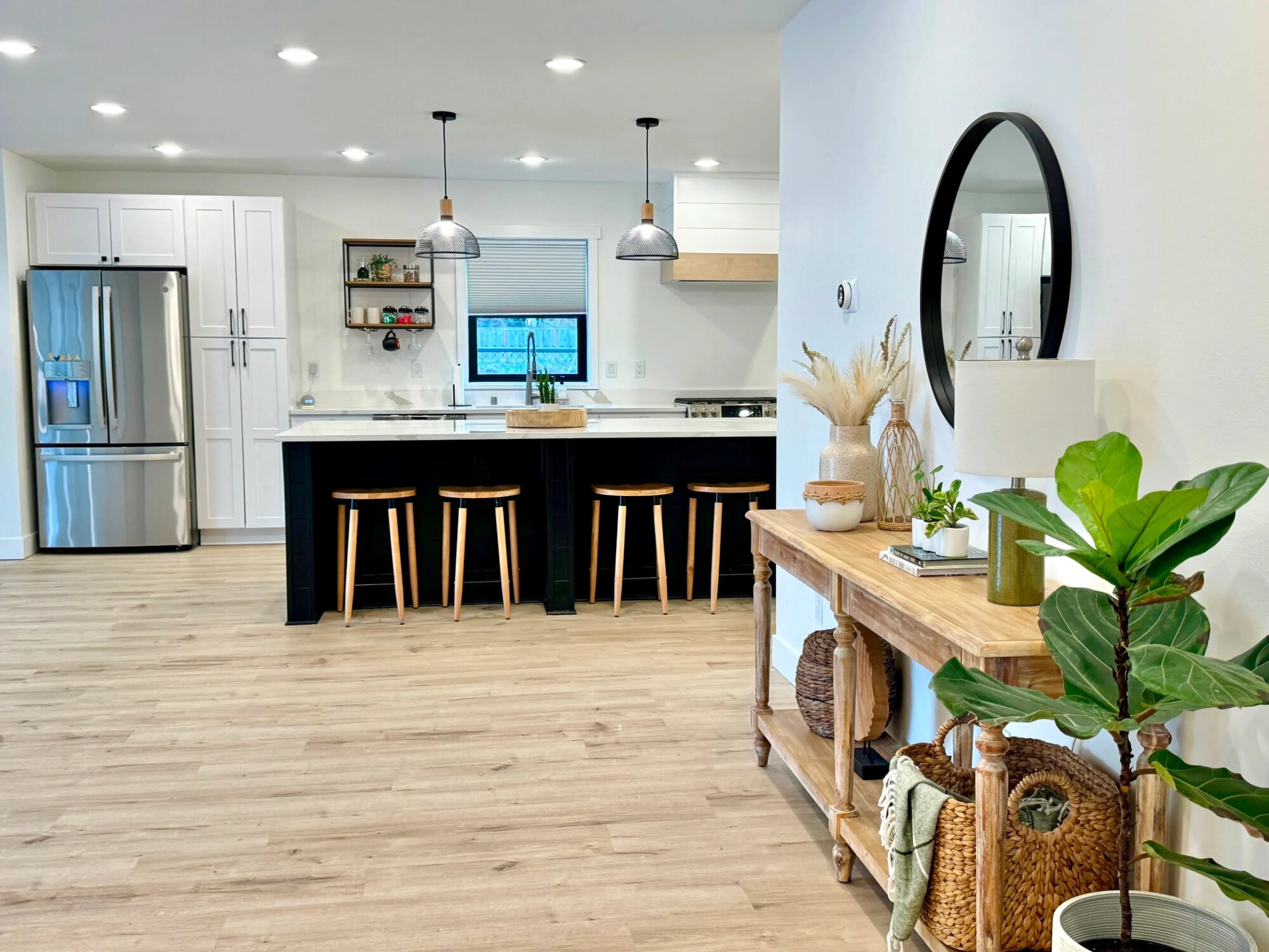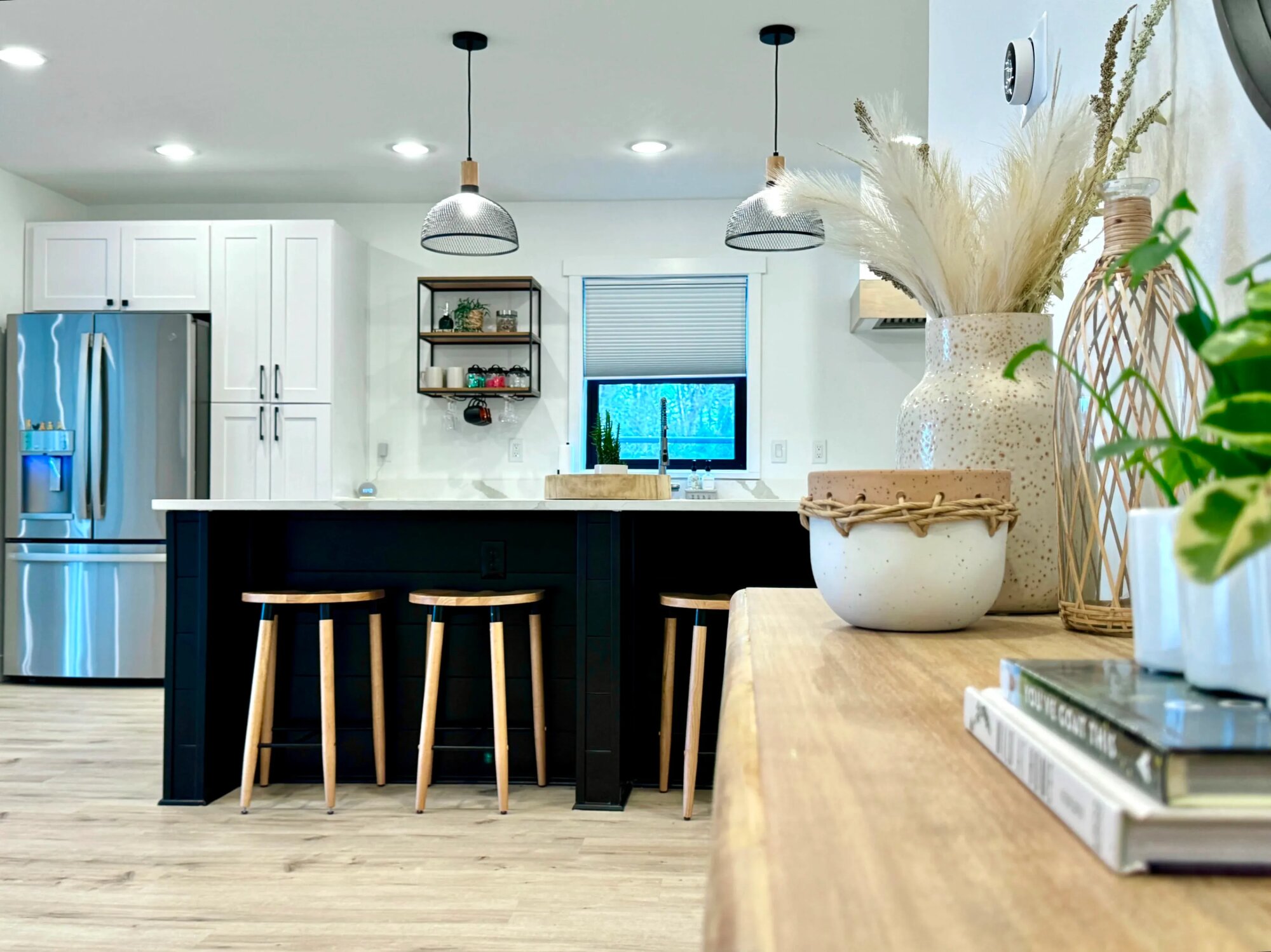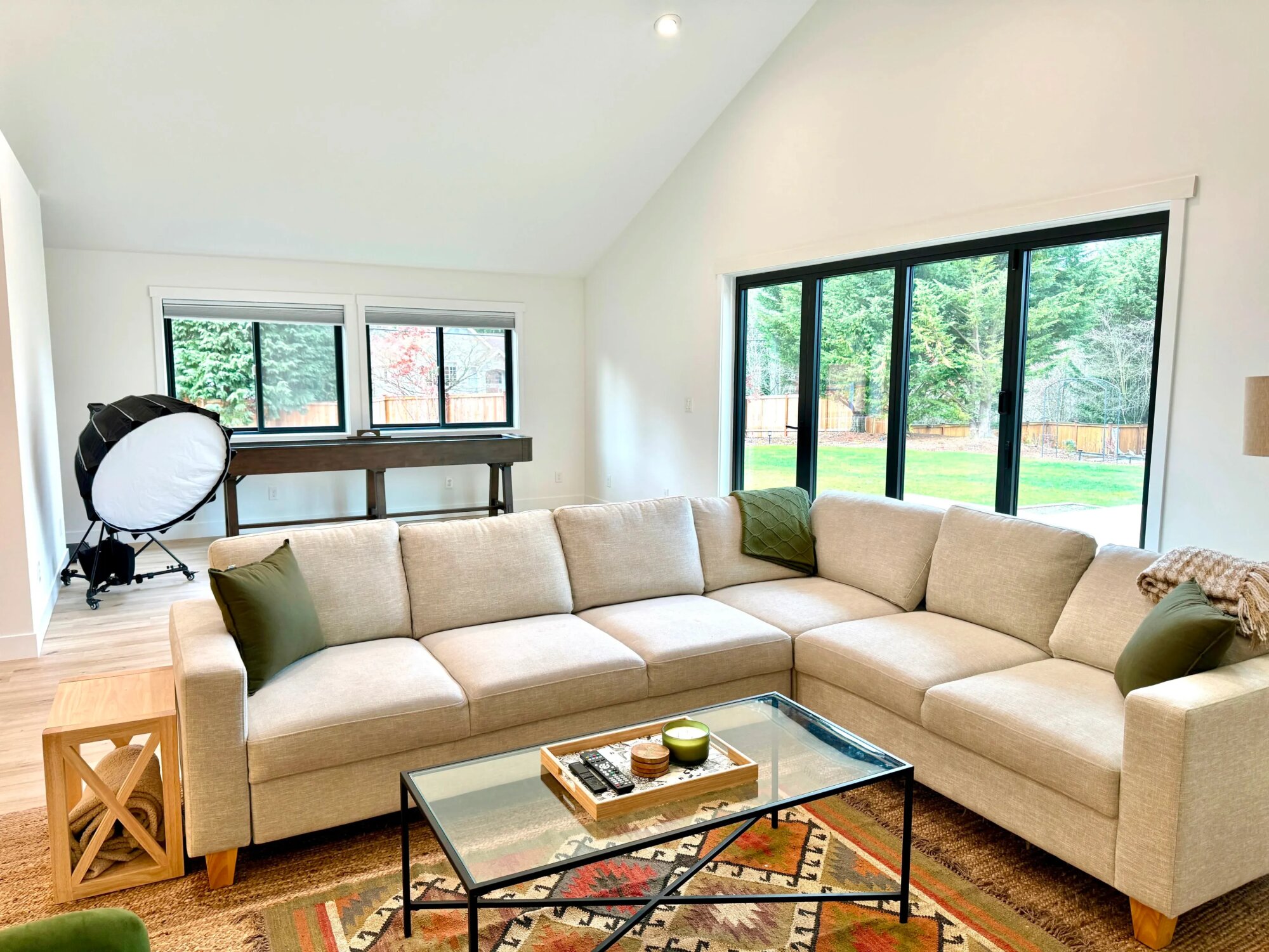 Jednopodlažný dom s otvoreným hlavným priestorom a čistým, neutrálnym interiérom. Celková plocha domu je približne 140 m². Dispozícia zahŕňa veľký spoločný priestor s obývačkou, kuchyňou a jedálňou, jednu spálňu a kúpeľňu. Interiér má biele steny, svetlé drevené podlahy a jednoduché línie. Kuchyňa má kontrastný tmavý ostrov. Priestor je plne zariadený, no dekorácie je možné presúvať podľa potreby. Veľké posuvné okná a presklené dvere zabezpečujú silné prirodzené svetlo. Všetky okná majú plne nastaviteľné zatemňovacie rolety. Spálňa má južne orientované okno s mäkkým, tlmeným svetlom. Priestor je technicky pripravený na produkciu. K dispozícii je viacero samostatných 20 A elektrických okruhov a dostatok zásuviek v celom dome. Kúpeľňa je priestranná a vhodná ako šatňa alebo zóna pre make-up a styling.